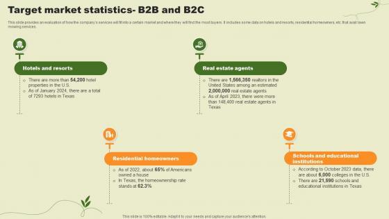 This slide provides an evaluation of how the companys services will fit into a certain market and where they will find the most buyers. It includes some data on hotels and resorts, residential homeowners, etc. that avail lawn mowing services. Slidegeeks is one of the best resources for PowerPoint templates. You can download easily and regulate Target Market Statistics B2b And B2c Landscaping Business Plan Ppt Sample BP SS V for your personal presentations from our wonderful collection. A few clicks is all it takes to discover and get the most relevant and appropriate templates. Use our Templates to add a unique zing and appeal to your presentation and meetings. All the slides are easy to edit and you can use them even for advertisement purposes. This slide provides an evaluation of how the companys services will fit into a certain market and where they will find the most buyers. It includes some data on hotels and resorts, residential homeowners, etc. that avail lawn mowing services.