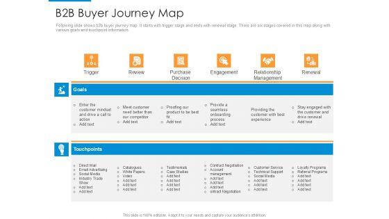 Following slide shows b2b buyer journey map. It starts with trigger stage and ends with renewal stage. There are six stages covered in this map along with various goals and touchpoint information. Presenting business to business market segmentation criteria b2b buyer journey map template pdf to provide visual cues and insights. Share and navigate important information on six stages that need your due attention. This template can be used to pitch topics like trigger, review, engagement, renewal, relationship management. In addtion, this PPT design contains high resolution images, graphics, etc, that are easily editable and available for immediate download.