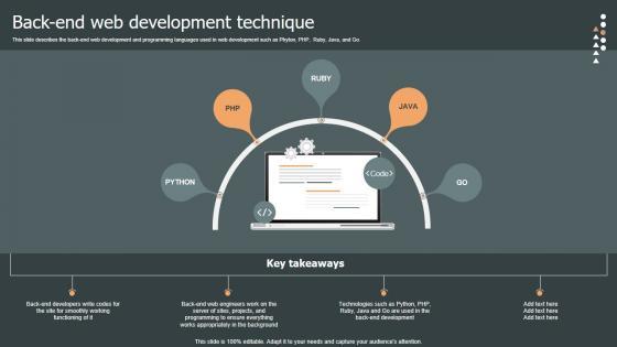 This slide describes the back end web development and programming languages used in web development such as Phyton, PHP, Ruby, Java, and Go.This is a Website Designing And Development Service Back End Web Development Technique Pictures PDF template with various stages. Focus and dispense information on five stages using this creative set, that comes with editable features. It contains large content boxes to add your information on topics like Technologies Such, Programming To Ensure, Appropriately In The Background You can also showcase facts, figures, and other relevant content using this PPT layout. Grab it now.