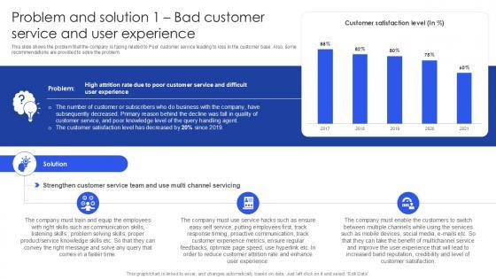 This slide shows the problem that the company is facing related to Poor customer service leading to loss in the customer base. Also, some recommendations are provided to solve the problem. Deliver an awe inspiring pitch with this creative problem and solution 1 bad customer service and user experience ppt portfolio picture pdf bundle. Topics like customer service, strengthen customer service team, customer satisfaction level, product service, communication skills can be discussed with this completely editable template. It is available for immediate download depending on the needs and requirements of the user.