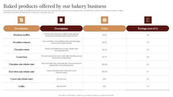 This slide provides glimpse about different products and services created by the bakery that are available in the market for the customers. It includes blueberry muffins, breakfast croissant, chocolate eclairs, lemon bars, chocolate cake, etc.Here you can discover an assortment of the finest PowerPoint and Google Slides templates. With these templates, you can create presentations for a variety of purposes while simultaneously providing your audience with an eye catching visual experience. Download Baked Products Offered By Our Bakery Strategic Advertising Plan For Bakehouse Themes Pdf to deliver an impeccable presentation. These templates will make your job of preparing presentations much quicker, yet still, maintain a high level of quality. Slidegeeks has experienced researchers who prepare these templates and write high quality content for you. Later on, you can personalize the content by editing the Baked Products Offered By Our Bakery Strategic Advertising Plan For Bakehouse Themes Pdf. This slide provides glimpse about different products and services created by the bakery that are available in the market for the customers. It includes blueberry muffins, breakfast croissant, chocolate eclairs, lemon bars, chocolate cake, etc.