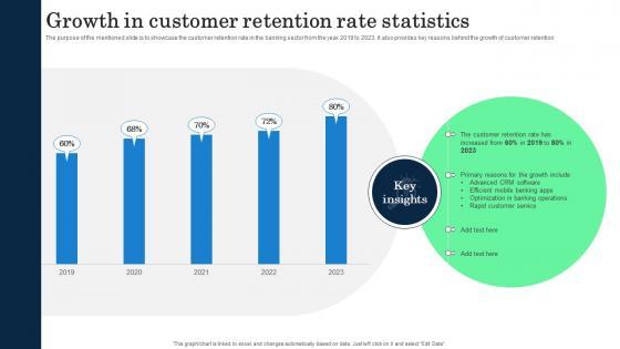 The purpose of the mentioned slide is to showcase the customer retention rate in the banking sector from the year 2019 to 2023. it also provides key reasons behind the growth of customer retention. The Growth In Customer Retention Rate Statistics Incorporating Banking Operational Growth is a compilation of the most recent design trends as a series of slides. It is suitable for any subject or industry presentation, containing attractive visuals and photo spots for businesses to clearly express their messages. This template contains a variety of slides for the user to input data, such as structures to contrast two elements, bullet points, and slides for written information. Slidegeeks is prepared to create an impression. The purpose of the mentioned slide is to showcase the customer retention rate in the banking sector from the year 2019 to 2023. it also provides key reasons behind the growth of customer retention
