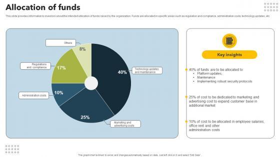 This slide provides information to investors about the intended utilization of funds raised by the organization. Funds are allocated in specific areas such as regulation and compliance, administration costs, technology updates, etc. Find a pre designed and impeccable Allocation Of Funds Mobile Banking App Investor Funding Elevator Pitch Deck The templates can ace your presentation without additional effort. You can download these easy to edit presentation templates to make your presentation stand out from others. So, what are you waiting for Download the template from Slidegeeks today and give a unique touch to your presentation. This slide provides information to investors about the intended utilization of funds raised by the organization. Funds are allocated in specific areas such as regulation and compliance, administration costs, technology updates, etc.
