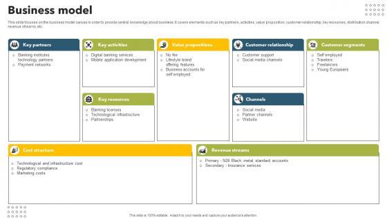 This slide focuses on the business model canvas in order to provide central knowledge about business. It covers elements such as key partners, activities, value proposition, customer relationship, key resources, distribution channel, revenue streams, etc. Boost your pitch with our creative Business Model Mobile Banking App Investor Funding Elevator Pitch Deck Deliver an awe inspiring pitch that will mesmerize everyone. Using these presentation templates you will surely catch everyones attention. You can browse the ppts collection on our website. We have researchers who are experts at creating the right content for the templates. So you do not have to invest time in any additional work. Just grab the template now and use them. This slide focuses on the business model canvas in order to provide central knowledge about business. It covers elements such as key partners, activities, value proposition, customer relationship, key resources, distribution channel, revenue streams, etc.