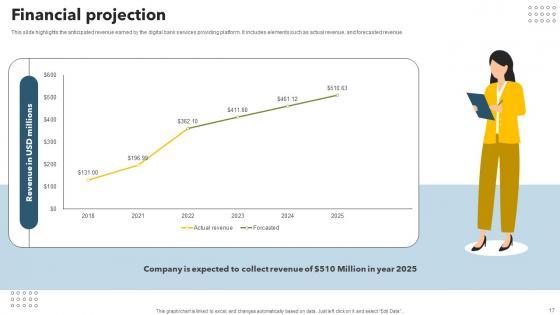 This slide highlights the anticipated revenue earned by the digital bank services providing platform. It includes elements such as actual revenue, and forecasted revenue. Slidegeeks is here to make your presentations a breeze with Financial Projection Mobile Banking App Investor Funding Elevator Pitch Deck With our easy to use and customizable templates, you can focus on delivering your ideas rather than worrying about formatting. With a variety of designs to choose from, you are sure to find one that suits your needs. And with animations and unique photos, illustrations, and fonts, you can make your presentation pop. So whether you are giving a sales pitch or presenting to the board, make sure to check out Slidegeeks first This slide highlights the anticipated revenue earned by the digital bank services providing platform. It includes elements such as actual revenue, and forecasted revenue.