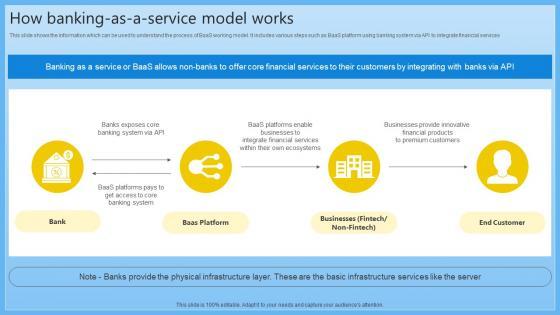 This slide shows the information which can be used to understand the process of BaaS working model. It includes various steps such as BaaS platform using banking system via API to integrate financial services Are you searching for a Beginners Guide To Commercial How Banking As A Service Model Works Fin SS V that is uncluttered, straightforward, and original Its easy to edit, and you can change the colors to suit your personal or business branding. For a presentation that expresses how much effort you have put in, this template is ideal With all of its features, including tables, diagrams, statistics, and lists, its perfect for a business plan presentation. Make your ideas more appealing with these professional slides. Download Beginners Guide To Commercial How Banking As A Service Model Works Fin SS V from Slidegeeks today. This slide shows the information which can be used to understand the process of BaaS working model. It includes various steps such as BaaS platform using banking system via API to integrate financial services