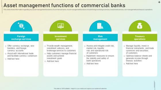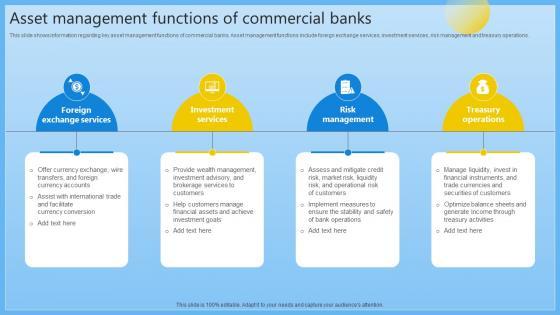 This slide shows information regarding key asset management functions of commercial banks. Asset management functions include foreign exchange services, investment services, risk management and treasury operations. From laying roadmaps to briefing everything in detail, our templates are perfect for you. You can set the stage with your presentation slides. All you have to do is download these easy-to-edit and customizable templates. Asset Management Functions Of Commercial Banks Complete Guide On Managing Banking Fin SS V will help you deliver an outstanding performance that everyone would remember and praise you for. Do download this presentation today. This slide shows information regarding key asset management functions of commercial banks. Asset management functions include foreign exchange services, investment services, risk management and treasury operations.
