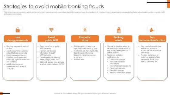 This slide shows various tactics which can be used mobile banking users to secure their devices from various types of cyberattacks. It includes tips such as use strong passwords, two factor authentication, avoid using public WIFI and use biometrics data.This modern and well-arranged Strategies To Avoid Mobile Banking Frauds Comprehensive Smartphone Banking Slides Pdf provides lots of creative possibilities. It is very simple to customize and edit with the Powerpoint Software. Just drag and drop your pictures into the shapes. All facets of this template can be edited with Powerpoint no extra software is necessary. Add your own material, put your images in the places assigned for them, adjust the colors, and then you can show your slides to the world, with an animated slide included. This slide shows various tactics which can be used mobile banking users to secure their devices from various types of cyberattacks. It includes tips such as use strong passwords, two factor authentication, avoid using public WIFI and use biometrics data.
