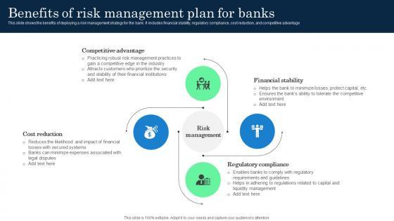 This slide shows the benefits of deploying a risk management strategy for the bank. It includes financial stability, regulatory compliance, cost reduction, and competitive advantage. Get a simple yet stunning designed Benefits Of Risk Management Plan For Banks Incorporating Banking Operational Growth. It is the best one to establish the tone in your meetings. It is an excellent way to make your presentations highly effective. So, download this PPT today from Slidegeeks and see the positive impacts. Our easy-to-edit Benefits Of Risk Management Plan For Banks Incorporating Banking Operational Growth can be your go-to option for all upcoming conferences and meetings. So, what are you waiting for Grab this template today. This slide shows the benefits of deploying a risk management strategy for the bank. It includes financial stability, regulatory compliance, cost reduction, and competitive advantage.