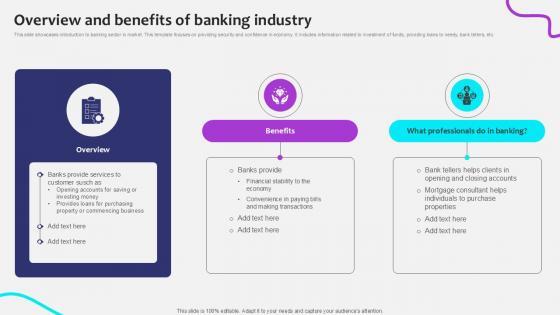 This slide showcases introduction to banking sector in market. This template focuses on providing security and confidence in economy. It includes information related to investment of funds, providing loans to needy, bank tellers, etc. Explore a selection of the finest Overview And Benefits Of Banking Initiating Globalization Of Banking Ppt Powerpoint here. With a plethora of professionally designed and pre-made slide templates, you can quickly and easily find the right one for your upcoming presentation. You can use our Overview And Benefits Of Banking Initiating Globalization Of Banking Ppt Powerpoint to effectively convey your message to a wider audience. Slidegeeks has done a lot of research before preparing these presentation templates. The content can be personalized and the slides are highly editable. Grab templates today from Slidegeeks. This slide showcases introduction to banking sector in market. This template focuses on providing security and confidence in economy. It includes information related to investment of funds, providing loans to needy, bank tellers, etc.