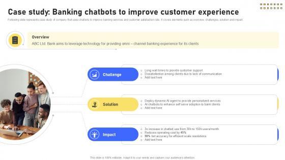 Following slide represents case study of company that uses chatbots to improve banking services and customer satisfaction rate. It covers elements such as overview, challenges, solution and impact. Boost your pitch with our creative Case Study Banking Chatbots To Improve Customer Experience IoT In Banking For Digital Future IoT SS V. Deliver an awe-inspiring pitch that will mesmerize everyone. Using these presentation templates you will surely catch everyones attention. You can browse the ppts collection on our website. We have researchers who are experts at creating the right content for the templates. So you do not have to invest time in any additional work. Just grab the template now and use them. Following slide represents case study of company that uses chatbots to improve banking services and customer satisfaction rate. It covers elements such as overview, challenges, solution and impact.