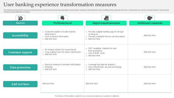 The following slide exhibits various problems faced by customer during banking operations and provides measure to eliminate them, thus building strong customer trust. Key components are service, problems faced, improvement measures and additional comments. Showcasing this set of slides titled User Banking Experience Transformation Measures Topics Pdf. The topics addressed in these templates are Accessibility, Customer Support, Data Protection. All the content presented in this PPT design is completely editable. Download it and make adjustments in color, background, font etc. as per your unique business setting. The following slide exhibits various problems faced by customer during banking operations and provides measure to eliminate them, thus building strong customer trust. Key components are service, problems faced, improvement measures and additional comments.