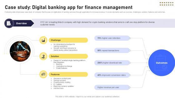 Following slide showcases case study of company that focuses on digitization of banking services through application to increase revenue. It covers elements such as overview, challenges, solution, features and outcomes. Create an editable Case Study Digital Banking App For Finance Management IoT In Banking For Digital Future IoT SS V that communicates your idea and engages your audience. Whether you are presenting a business or an educational presentation, pre-designed presentation templates help save time. Case Study Digital Banking App For Finance Management IoT In Banking For Digital Future IoT SS V is highly customizable and very easy to edit, covering many different styles from creative to business presentations. Slidegeeks has creative team members who have crafted amazing templates. So, go and get them without any delay. Following slide showcases case study of company that focuses on digitization of banking services through application to increase revenue. It covers elements such as overview, challenges, solution, features and outcomes.