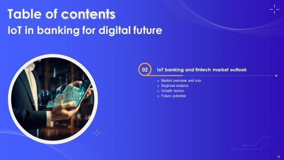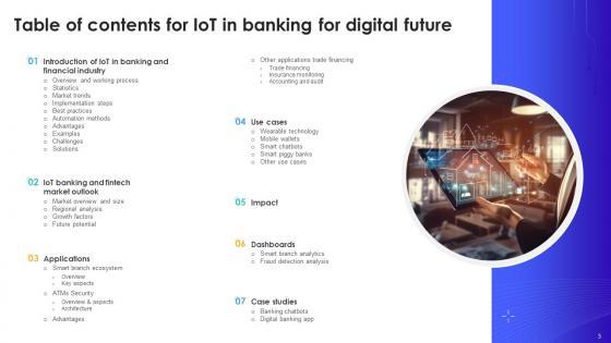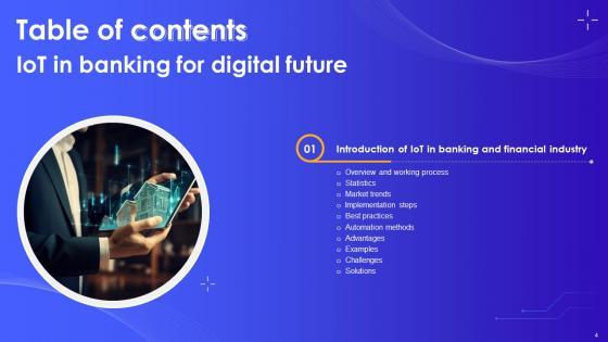 Find a pre-designed and impeccable Table Of Contents IoT In Banking For Digital Future IoT SS V. The templates can ace your presentation without additional effort. You can download these easy-to-edit presentation templates to make your presentation stand out from others. So, what are you waiting for Download the template from Slidegeeks today and give a unique touch to your presentation. Our Table Of Contents IoT In Banking For Digital Future IoT SS V are topically designed to provide an attractive backdrop to any subject. Use them to look like a presentation pro.
