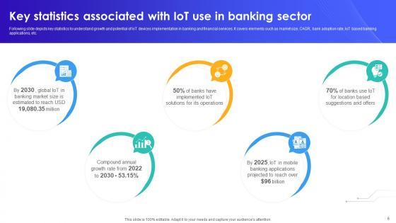Following slide depicts key statistics to understand growth and potential of IoT devices implementation in banking and financial services. It covers elements such as market size, CAGR, bank adoption rate, IoT based banking applications, etc. Welcome to our selection of the Key Statistics Associated With IoT Use In Banking Sector IoT In Banking For Digital Future IoT SS V. These are designed to help you showcase your creativity and bring your sphere to life. Planning and Innovation are essential for any business that is just starting out. This collection contains the designs that you need for your everyday presentations. All of our PowerPoints are 100Percent editable, so you can customize them to suit your needs. This multi-purpose template can be used in various situations. Grab these presentation templates today. Following slide depicts key statistics to understand growth and potential of IoT devices implementation in banking and financial services. It covers elements such as market size, CAGR, bank adoption rate, IoT based banking applications, etc.