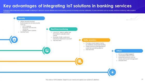 Following slide showcases various benefits of utilizing IoT devices to assure effective and smart banking services increasing customer satisfaction. It covers elements such as security, real time monitoring, better analytics and others. Coming up with a presentation necessitates that the majority of the effort goes into the content and the message you intend to convey. The visuals of a PowerPoint presentation can only be effective if it supplements and supports the story that is being told. Keeping this in mind our experts created Key Advantages Of Integrating IoT Solutions In Banking IoT In Banking For Digital Future IoT SS V to reduce the time that goes into designing the presentation. This way, you can concentrate on the message while our designers take care of providing you with the right template for the situation. Following slide showcases various benefits of utilizing IoT devices to assure effective and smart banking services increasing customer satisfaction. It covers elements such as security, real time monitoring, better analytics and others.