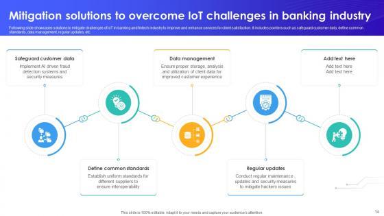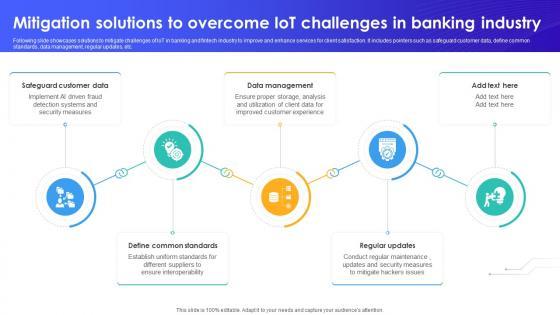 Following slide showcases solutions to mitigate challenges of IoT in banking and fintech industry to improve and enhance services for client satisfaction. It includes pointers such as safeguard customer data, define common standards, data management, regular updates, etc. Explore a selection of the finest Mitigation Solutions To Overcome IoT Challenges In Banking IoT In Banking For Digital Future IoT SS V here. With a plethora of professionally designed and pre-made slide templates, you can quickly and easily find the right one for your upcoming presentation. You can use our Mitigation Solutions To Overcome IoT Challenges In Banking IoT In Banking For Digital Future IoT SS V to effectively convey your message to a wider audience. Slidegeeks has done a lot of research before preparing these presentation templates. The content can be personalized and the slides are highly editable. Grab templates today from Slidegeeks. Following slide showcases solutions to mitigate challenges of IoT in banking and fintech industry to improve and enhance services for client satisfaction. It includes pointers such as safeguard customer data, define common standards, data management, regular updates, etc.