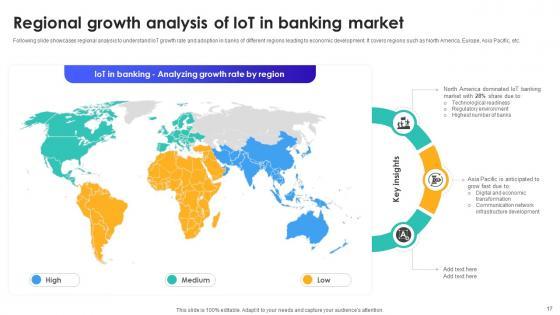 Following slide showcases regional analysis to understand IoT growth rate and adoption in banks of different regions leading to economic development. It covers regions such as North America, Europe, Asia Pacific, etc. Presenting this PowerPoint presentation, titled Regional Growth Analysis Of IoT In Banking Market IoT In Banking For Digital Future IoT SS V, with topics curated by our researchers after extensive research. This editable presentation is available for immediate download and provides attractive features when used. Download now and captivate your audience. Presenting this Regional Growth Analysis Of IoT In Banking Market IoT In Banking For Digital Future IoT SS V. Our researchers have carefully researched and created these slides with all aspects taken into consideration. This is a completely customizable Regional Growth Analysis Of IoT In Banking Market IoT In Banking For Digital Future IoT SS V that is available for immediate downloading. Download now and make an impact on your audience. Highlight the attractive features available with our PPTs. Following slide showcases regional analysis to understand IoT growth rate and adoption in banks of different regions leading to economic development. It covers regions such as North America, Europe, Asia Pacific, etc.