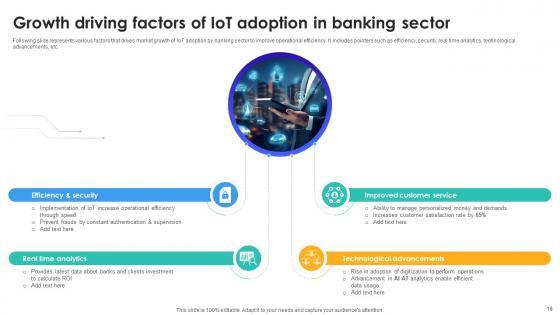 Following slide represents various factors that drives market growth of IoT adoption by banking sector to improve operational efficiency. It includes pointers such as efficiency, security, real time analytics, technological advancements, etc. Get a simple yet stunning designed Growth Driving Factors Of IoT Adoption In Banking Sector IoT In Banking For Digital Future IoT SS V. It is the best one to establish the tone in your meetings. It is an excellent way to make your presentations highly effective. So, download this PPT today from Slidegeeks and see the positive impacts. Our easy-to-edit Growth Driving Factors Of IoT Adoption In Banking Sector IoT In Banking For Digital Future IoT SS V can be your go-to option for all upcoming conferences and meetings. So, what are you waiting for Grab this template today. Following slide represents various factors that drives market growth of IoT adoption by banking sector to improve operational efficiency. It includes pointers such as efficiency, security, real time analytics, technological advancements, etc.