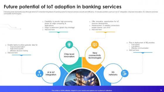 Following slide represents ways through which IoT is transforming future of banking sector to improve services security and efficiency. It includes pointers such as AI and IoT integration, chip level innovation, 5G networks and new connectivity technologies. There are so many reasons you need a Future Potential Of IoT Adoption In Banking Services IoT In Banking For Digital Future IoT SS V. The first reason is you can not spend time making everything from scratch, Thus, Slidegeeks has made presentation templates for you too. You can easily download these templates from our website easily. Following slide represents ways through which IoT is transforming future of banking sector to improve services security and efficiency. It includes pointers such as AI and IoT integration, chip level innovation, 5G networks and new connectivity technologies.