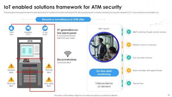 Following slide showcases framework to understand use of IoT solutions for remote monitoring of ATM sites assuring security. It includes elements such as alerts, integrated CCTV, secure wireless communication, etc. If your project calls for a presentation, then Slidegeeks is your go-to partner because we have professionally designed, easy-to-edit templates that are perfect for any presentation. After downloading, you can easily edit IoT Enabled Solutions Framework For Atm Security IoT In Banking For Digital Future IoT SS V and make the changes accordingly. You can rearrange slides or fill them with different images. Check out all the handy templates Following slide showcases framework to understand use of IoT solutions for remote monitoring of ATM sites assuring security. It includes elements such as alerts, integrated CCTV, secure wireless communication, etc.