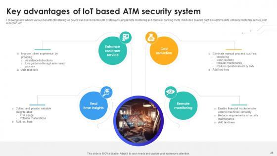 Following slide exhibits various benefits of installing IoT devices and sensors into ATM system assuring remote monitoring and control of banking assts. It includes pointers such as real time data, enhance customer service, cost reduction, etc. This modern and well-arranged Key Advantages Of IoT Based Atm Security System IoT In Banking For Digital Future IoT SS V provides lots of creative possibilities. It is very simple to customize and edit with the Powerpoint Software. Just drag and drop your pictures into the shapes. All facets of this template can be edited with Powerpoint, no extra software is necessary. Add your own material, put your images in the places assigned for them, adjust the colors, and then you can show your slides to the world, with an animated slide included. Following slide exhibits various benefits of installing IoT devices and sensors into ATM system assuring remote monitoring and control of banking assts. It includes pointers such as real time data, enhance customer service, cost reduction, etc.