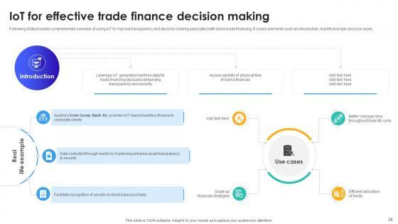 Following slide provides comprehensive overview of using IoT to improve transparency and decision making associated with banks trade financing. It covers elements such as introduction, real life example and use cases. If you are looking for a format to display your unique thoughts, then the professionally designed IoT For Effective Trade Finance Decision Making IoT In Banking For Digital Future IoT SS V is the one for you. You can use it as a Google Slides template or a PowerPoint template. Incorporate impressive visuals, symbols, images, and other charts. Modify or reorganize the text boxes as you desire. Experiment with shade schemes and font pairings. Alter, share or cooperate with other people on your work. Download IoT For Effective Trade Finance Decision Making IoT In Banking For Digital Future IoT SS V and find out how to give a successful presentation. Present a perfect display to your team and make your presentation unforgettable. Following slide provides comprehensive overview of using IoT to improve transparency and decision making associated with banks trade financing. It covers elements such as introduction, real life example and use cases.