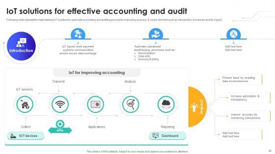 Following slide represents implementing IoT solutions to automate accounting and auditing process for improving accuracy. It covers element such as introduction, framework and its impact. Formulating a presentation can take up a lot of effort and time, so the content and message should always be the primary focus. The visuals of the PowerPoint can enhance the presenters message, so our IoT Solutions For Effective Accounting And Audit IoT In Banking For Digital Future IoT SS V was created to help save time. Instead of worrying about the design, the presenter can concentrate on the message while our designers work on creating the ideal templates for whatever situation is needed. Slidegeeks has experts for everything from amazing designs to valuable content, we have put everything into IoT Solutions For Effective Accounting And Audit IoT In Banking For Digital Future IoT SS V. Following slide represents implementing IoT solutions to automate accounting and auditing process for improving accuracy. It covers element such as introduction, framework and its impact.