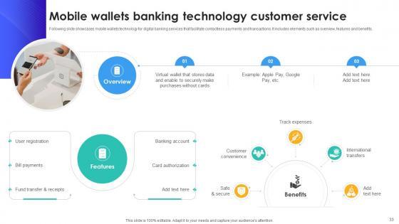 Following slide showcases mobile wallets technology for digital banking services that facilitate contactless payments and transactions. It includes elements such as overview, features and benefits. The best PPT templates are a great way to save time, energy, and resources. Slidegeeks have 100 percent editable powerpoint slides making them incredibly versatile. With these quality presentation templates, you can create a captivating and memorable presentation by combining visually appealing slides and effectively communicating your message. Download Mobile Wallets Banking Technology Customer Service IoT In Banking For Digital Future IoT SS V from Slidegeeks and deliver a wonderful presentation. Following slide showcases mobile wallets technology for digital banking services that facilitate contactless payments and transactions. It includes elements such as overview, features and benefits.