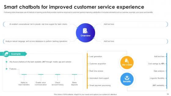 Following slide showcases use of chatbots in banking sector that provides real time response to customer queries improving satisfaction. It includes elements such as overview, example, use cases and benefits. Here you can discover an assortment of the finest PowerPoint and Google Slides templates. With these templates, you can create presentations for a variety of purposes while simultaneously providing your audience with an eye-catching visual experience. Download Smart Chatbots For Improved Customer Service Experience IoT In Banking For Digital Future IoT SS V to deliver an impeccable presentation. These templates will make your job of preparing presentations much quicker, yet still, maintain a high level of quality. Slidegeeks has experienced researchers who prepare these templates and write high-quality content for you. Later on, you can personalize the content by editing the Smart Chatbots For Improved Customer Service Experience IoT In Banking For Digital Future IoT SS V. Following slide showcases use of chatbots in banking sector that provides real time response to customer queries improving satisfaction. It includes elements such as overview, example, use cases and benefits.