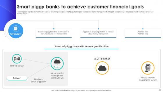 Following slide provides comprehensive overview of banking innovation smart piggy that helps in financial and money management that helps to saves money. It includes elements such as overview and working process. This Smart Piggy Banks To Achieve Customer Financial Goals IoT In Banking For Digital Future IoT SS V from Slidegeeks makes it easy to present information on your topic with precision. It provides customization options, so you can make changes to the colors, design, graphics, or any other component to create a unique layout. It is also available for immediate download, so you can begin using it right away. Slidegeeks has done good research to ensure that you have everything you need to make your presentation stand out. Make a name out there for a brilliant performance. Following slide provides comprehensive overview of banking innovation smart piggy that helps in financial and money management that helps to saves money. It includes elements such as overview and working process.
