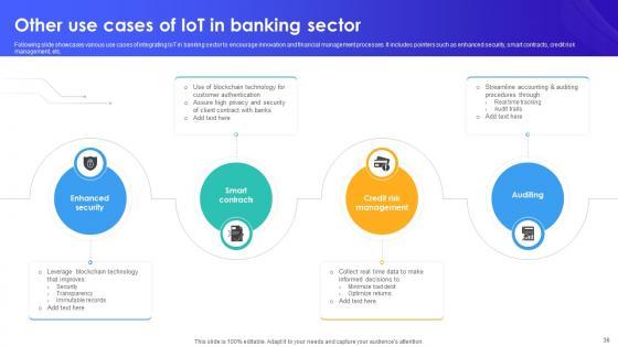 Following slide showcases various use cases of integrating IoT in banking sector to encourage innovation and financial management processes. It includes pointers such as enhanced security, smart contracts, credit risk management, etc. The Other Use Cases Of IoT In Banking Sector IoT In Banking For Digital Future IoT SS V is a compilation of the most recent design trends as a series of slides. It is suitable for any subject or industry presentation, containing attractive visuals and photo spots for businesses to clearly express their messages. This template contains a variety of slides for the user to input data, such as structures to contrast two elements, bullet points, and slides for written information. Slidegeeks is prepared to create an impression. Following slide showcases various use cases of integrating IoT in banking sector to encourage innovation and financial management processes. It includes pointers such as enhanced security, smart contracts, credit risk management, etc.