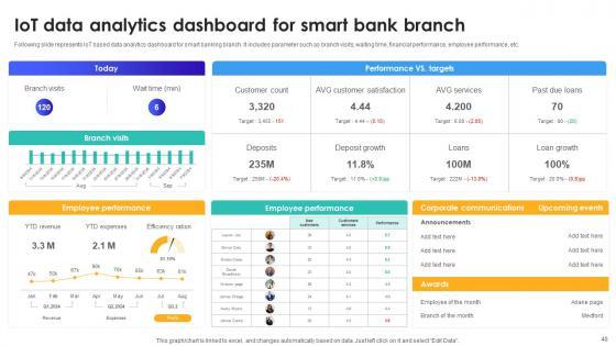 Following slide represents IoT based data analytics dashboard for smart banking branch. It includes parameter such as branch visits, waiting time, financial performance, employee performance, etc. Do you have an important presentation coming up Are you looking for something that will make your presentation stand out from the rest Look no further than IoT Data Analytics Dashboard For Smart Bank Branch IoT In Banking For Digital Future IoT SS V. With our professional designs, you can trust that your presentation will pop and make delivering it a smooth process. And with Slidegeeks, you can trust that your presentation will be unique and memorable. So why wait Grab IoT Data Analytics Dashboard For Smart Bank Branch IoT In Banking For Digital Future IoT SS V today and make your presentation stand out from the rest Following slide represents IoT based data analytics dashboard for smart banking branch. It includes parameter such as branch visits, waiting time, financial performance, employee performance, etc.