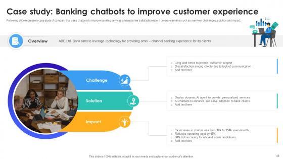 Following slide represents case study of company that uses chatbots to improve banking services and customer satisfaction rate. It covers elements such as overview, challenges, solution and impact. Boost your pitch with our creative Case Study Banking Chatbots To Improve Customer Experience IoT In Banking For Digital Future IoT SS V. Deliver an awe-inspiring pitch that will mesmerize everyone. Using these presentation templates you will surely catch everyones attention. You can browse the ppts collection on our website. We have researchers who are experts at creating the right content for the templates. So you do not have to invest time in any additional work. Just grab the template now and use them. Following slide represents case study of company that uses chatbots to improve banking services and customer satisfaction rate. It covers elements such as overview, challenges, solution and impact.