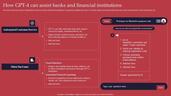 This slide showcases various AI applications which can banks and financial institutions manage their activities through AI. It provides details about automated customer service, fraud detection, financial reporting, etc. Are you in need of a template that can accommodate all of your creative concepts This one is crafted professionally and can be altered to fit any style. Use it with Google Slides or PowerPoint. Include striking photographs, symbols, depictions, and other visuals. Fill, move around, or remove text boxes as desired. Test out color palettes and font mixtures. Edit and save your work, or work with colleagues. Download How GPT 4 Can Assist Banks GPT 4 Revolutionary Generative AI Innovation Download Pdf and observe how to make your presentation outstanding. Give an impeccable presentation to your group and make your presentation unforgettable. This slide showcases various AI applications which can banks and financial institutions manage their activities through AI. It provides details about automated customer service, fraud detection, financial reporting, etc.