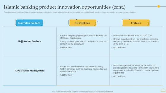 This slide depicts the future of Islamic banking and finance. It includes details related to Islamic banking, which has a bright future and is well-positioned to capitalize on new growth opportunities. Are you searching for a In Depth Analysis Of Islamic Banking Islamic Banking Product Innovation Opportunities Clipart PDF that is uncluttered, straightforward, and original It is easy to edit, and you can change the colors to suit your personal or business branding. For a presentation that expresses how much effort you have put in, this template is ideal With all of its features, including tables, diagrams, statistics, and lists, it is perfect for a business plan presentation. Make your ideas more appealing with these professional slides. Download In Depth Analysis Of Islamic Banking Islamic Banking Product Innovation Opportunities Clipart PDF from Slidegeeks today. This slide depicts the future of Islamic banking and finance. It includes details related to Islamic banking, which has a bright future and is well-positioned to capitalize on new growth opportunities.