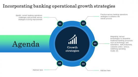 Find a pre-designed and impeccable Agenda Incorporating Banking Operational Growth Strategies. The templates can ace your presentation without additional effort. You can download these easy-to-edit presentation templates to make your presentation stand out from others. So, what are you waiting for Download the template from Slidegeeks today and give a unique touch to your presentation. Our Agenda Incorporating Banking Operational Growth Strategies are topically designed to provide an attractive backdrop to any subject. Use them to look like a presentation pro.