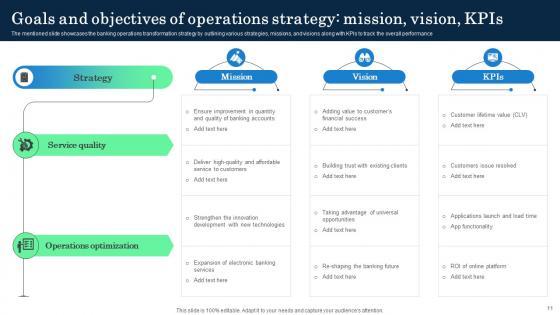 The mentioned slide showcases the banking operations transformation strategy by outlining various strategies, missions, and visions along with KPIs to track the overall performance. The best PPT templates are a great way to save time, energy, and resources. Slidegeeks have 100 percent editable powerpoint slides making them incredibly versatile. With these quality presentation templates, you can create a captivating and memorable presentation by combining visually appealing slides and effectively communicating your message. Download Goals And Objectives Of Operations Strategy Incorporating Banking Operational Growth from Slidegeeks and deliver a wonderful presentation. The mentioned slide showcases the banking operations transformation strategy by outlining various strategies, missions, and visions along with KPIs to track the overall performance