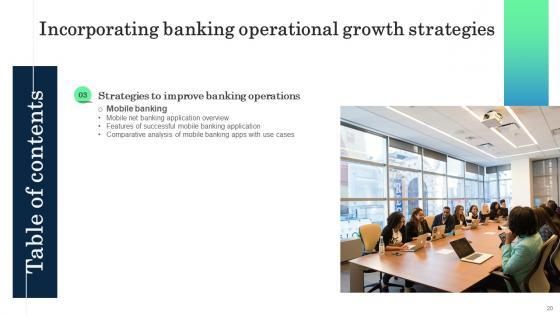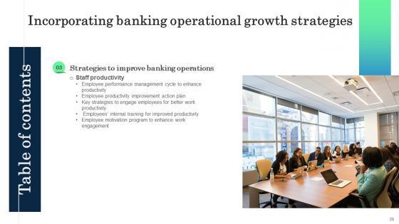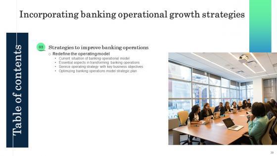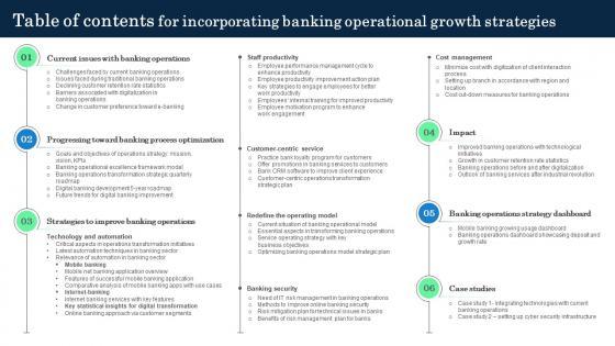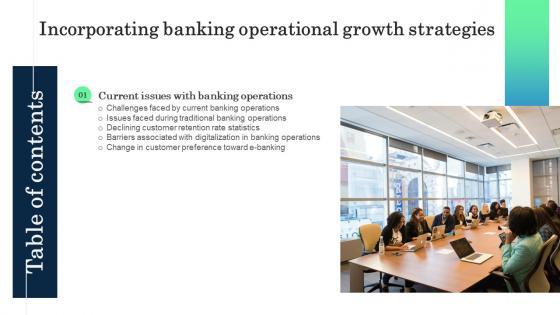Do you have to make sure that everyone on your team knows about any specific topic I yes, then you should give Table Of Contents Incorporating Banking Operational Growth Strategies a try. Our experts have put a lot of knowledge and effort into creating this impeccable Table Of Contents Incorporating Banking Operational Growth Strategies. You can use this template for your upcoming presentations, as the slides are perfect to represent even the tiniest detail. You can download these templates from the Slidegeeks website and these are easy to edit. So grab these today Our Table Of Contents Incorporating Banking Operational Growth Strategies are topically designed to provide an attractive backdrop to any subject. Use them to look like a presentation pro.