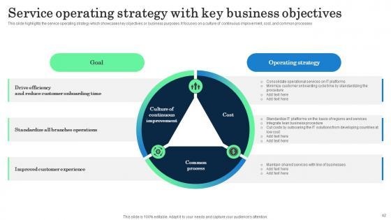 This slide highlights the service operating strategy which showcases key objectives or business purposes. It focuses on a culture of continuous improvement, cost, and common processes. Do you have an important presentation coming up Are you looking for something that will make your presentation stand out from the rest Look no further than Service Operating Strategy With Key Business Objectives Incorporating Banking Operational Growth. With our professional designs, you can trust that your presentation will pop and make delivering it a smooth process. And with Slidegeeks, you can trust that your presentation will be unique and memorable. So why wait Grab Service Operating Strategy With Key Business Objectives Incorporating Banking Operational Growth today and make your presentation stand out from the rest This slide highlights the service operating strategy which showcases key objectives or business purposes. It focuses on a culture of continuous improvement, cost, and common processes
