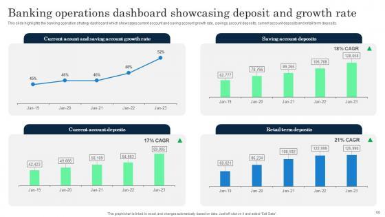 This slide highlights the banking operation strategy dashboard which showcases current account and saving account growth rate, savings account deposits, current account deposits and retail term deposits. Here you can discover an assortment of the finest PowerPoint and Google Slides templates. With these templates, you can create presentations for a variety of purposes while simultaneously providing your audience with an eye catching visual experience. Download Banking Operation Strategy Dashboard Highlighting Deposits And Growth Rate Structure PDF to deliver an impeccable presentation. These templates will make your job of preparing presentations much quicker, yet still, maintain a high level of quality. Slidegeeks has experienced researchers who prepare these templates and write high quality content for you. Later on, you can personalize the content by editing the Banking Operation Strategy Dashboard Highlighting Deposits And Growth Rate Structure PDF.