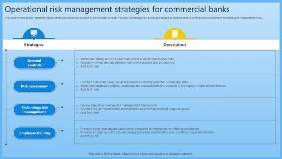 This slide shows details regarding various strategies which can be used by commercial banks to manage operational risk. It includes strategies such as internal controls, risk assessment, technology risk management, etc. This Operational Risk Management Strategies For Complete Guide On Managing Banking Fin SS V from Slidegeeks makes it easy to present information on your topic with precision. It provides customization options, so you can make changes to the colors, design, graphics, or any other component to create a unique layout. It is also available for immediate download, so you can begin using it right away. Slidegeeks has done good research to ensure that you have everything you need to make your presentation stand out. Make a name out there for a brilliant performance. This slide shows details regarding various strategies which can be used by commercial banks to manage operational risk. It includes strategies such as internal controls, risk assessment, technology risk management, etc.