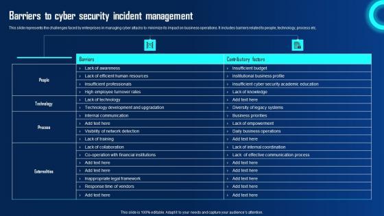 This slide represents the challenges faced by enterprises in managing cyber attacks to minimize its impact on business operations. It includes barriers related to people, technology, process etc. Find highly impressive Barriers To Cyber Security Incident Management Ppt Powerpoint Presentation File Professional Pdf on Slidegeeks to deliver a meaningful presentation. You can save an ample amount of time using these presentation templates. No need to worry to prepare everything from scratch because Slidegeeks experts have already done a huge research and work for you. You need to download Barriers To Cyber Security Incident Management Ppt Powerpoint Presentation File Professional Pdf for your upcoming presentation. All the presentation templates are 100 percent editable and you can change the color and personalize the content accordingly. Download now This slide represents the challenges faced by enterprises in managing cyber attacks to minimize its impact on business operations. It includes barriers related to people, technology, process etc.