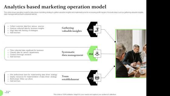 This slide shows operating model for data driven marketing strategy to gather valuable insights and implement same for increasing profit margins. It include steps such as gathering valuable insights, data management and team establishment etc.Showcasing this set of slides titled Analytics Based Marketing Operation Model Icons Pdf The topics addressed in these templates are Gathering Valuable Insights, Systematic Data Management, Team Establishment All the content presented in this PPT design is completely editable. Download it and make adjustments in color, background, font etc. as per your unique business setting. This slide shows operating model for data driven marketing strategy to gather valuable insights and implement same for increasing profit margins. It include steps such as gathering valuable insights, data management and team establishment etc.