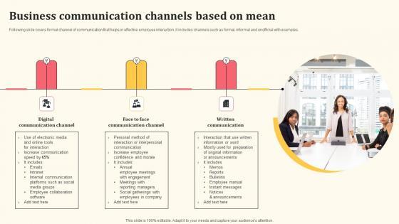 Following slide covers formal channel of communication that helps in effective employee interaction. It includes channels such as formal, informal and unofficial with examples. Make sure to capture your audiences attention in your business displays with our gratis customizable Business Communication Channels Based On Mean Detailed Personnel Elements Pdf These are great for business strategies, office conferences, capital raising or task suggestions. If you desire to acquire more customers for your tech business and ensure they stay satisfied, create your own sales presentation with these plain slides. Following slide covers formal channel of communication that helps in effective employee interaction. It includes channels such as formal, informal and unofficial with examples.