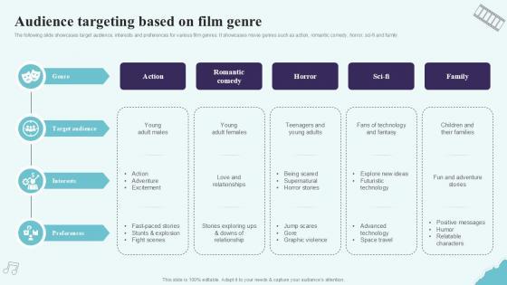 The following slide showcases target audience, interests and preferences for various film genres. It showcases movie genres such as action, romantic comedy, horror, sci-fi and family. Create an editable Audience Targeting Based On Film Genre Strategic Plan To Increase Film Ppt Sample Strategy SS V that communicates your idea and engages your audience. Whether you are presenting a business or an educational presentation, pre-designed presentation templates help save time. Audience Targeting Based On Film Genre Strategic Plan To Increase Film Ppt Sample Strategy SS V is highly customizable and very easy to edit, covering many different styles from creative to business presentations. Slidegeeks has creative team members who have crafted amazing templates. So, go and get them without any delay. The following slide showcases target audience, interests and preferences for various film genres. It showcases movie genres such as action, romantic comedy, horror, sci-fi and family.