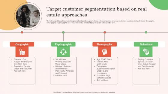 The following slide outlines market segmentation types through which real estate companies can group customers based on similar attributes. Geographic, demographic, psychographic, and behavioral are the common types which are outlined in the slide.Slidegeeks has constructed Target Customer Segmentation Based On Real Estate Property Marketing Professional Pdf after conducting extensive research and examination. These presentation templates are constantly being generated and modified based on user preferences and critiques from editors. Here, you will find the most attractive templates for a range of purposes while taking into account ratings and remarks from users regarding the content. This is an excellent jumping-off point to explore our content and will give new users an insight into our top-notch PowerPoint Templates. The following slide outlines market segmentation types through which real estate companies can group customers based on similar attributes. Geographic, demographic, psychographic, and behavioral are the common types which are outlined in the slide.