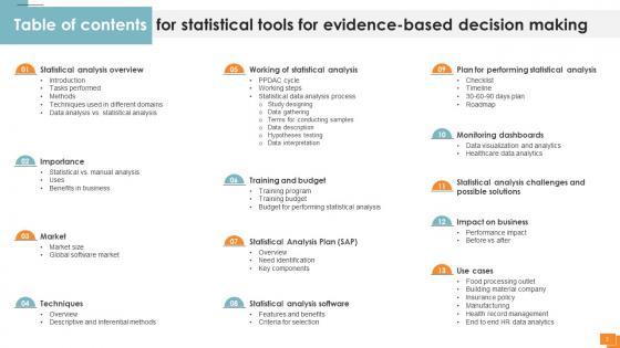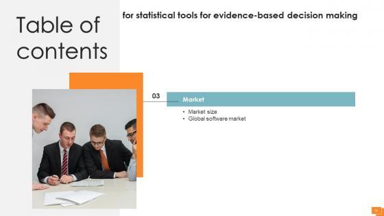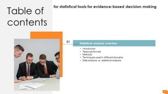 Slidegeeks is here to make your presentations a breeze with Table Of Contents For Statistical Tools For Evidence Based Decision Making With our easy-to-use and customizable templates, you can focus on delivering your ideas rather than worrying about formatting. With a variety of designs to choose from, you are sure to find one that suits your needs. And with animations and unique photos, illustrations, and fonts, you can make your presentation pop. So whether you are giving a sales pitch or presenting to the board, make sure to check out Slidegeeks first Our Table Of Contents For Statistical Tools For Evidence Based Decision Making are topically designed to provide an attractive backdrop to any subject. Use them to look like a presentation pro.