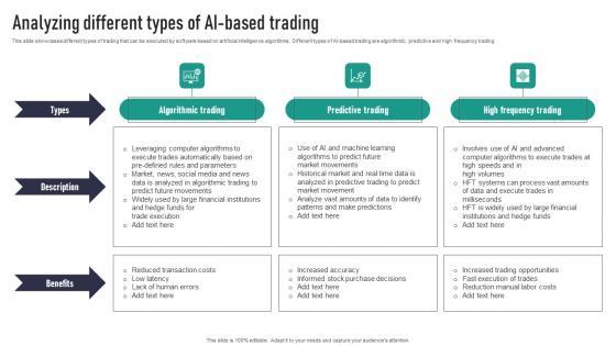 This slide showcases different types of trading that can be executed by software based on artificial intelligence algorithms. Different types of AI-based trading are algorithmic, predictive and high frequency trading. Slidegeeks is here to make your presentations a breeze with Analyzing Different Types Of AI Based Trading Professional Pdf With our easy-to-use and customizable templates, you can focus on delivering your ideas rather than worrying about formatting. With a variety of designs to choose from, you are sure to find one that suits your needs. And with animations and unique photos, illustrations, and fonts, you can make your presentation pop. So whether you are giving a sales pitch or presenting to the board, make sure to check out Slidegeeks first This slide showcases different types of trading that can be executed by software based on artificial intelligence algorithms. Different types of AI-based trading are algorithmic, predictive and high frequency trading.