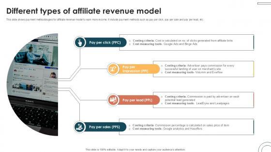 This slide shows payment methodologies for affiliate revenue model to earn more income. It include payment methods such as pay per click, pay per sale and pay per lead, etc. Formulating a presentation can take up a lot of effort and time, so the content and message should always be the primary focus. The visuals of the PowerPoint can enhance the presenters message, so our Different Types Of Affiliate Revenue Internet Based Trade Structure Ppt Example was created to help save time. Instead of worrying about the design, the presenter can concentrate on the message while our designers work on creating the ideal templates for whatever situation is needed. Slidegeeks has experts for everything from amazing designs to valuable content, we have put everything into Different Types Of Affiliate Revenue Internet Based Trade Structure Ppt Example This slide shows payment methodologies for affiliate revenue model to earn more income. It include payment methods such as pay per click, pay per sale and pay per lead, etc.